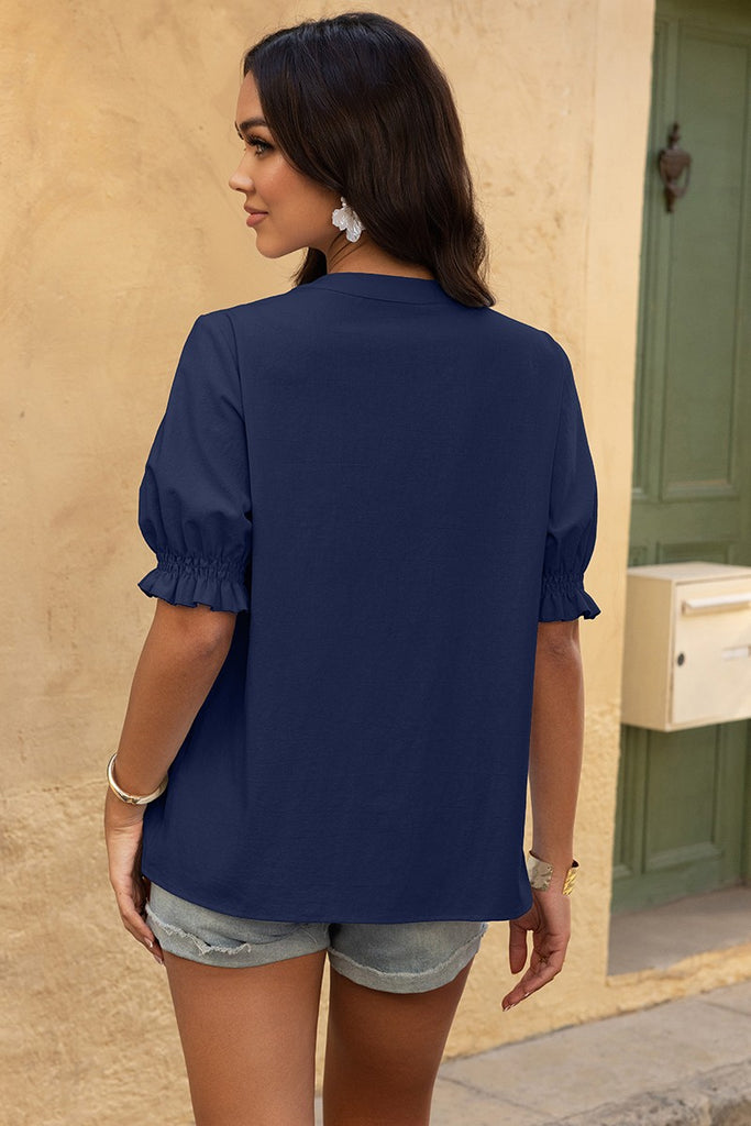 Effortlessly refined, the Vine Grace Blouse is crafted from 100% cotton for breathable comfort. It features a flattering V-neckline with a split mandarin collar, puff sleeves with elastic ruffle cuffs, and a button front for versatile styling. White floral vine embroidery adorns the front, adding delicate charm to the solid woven base. Finished at hip length with a relaxed fit, it’s the perfect top to pair with jeans, skirts, or trousers for a look that’s both timeless and easy.