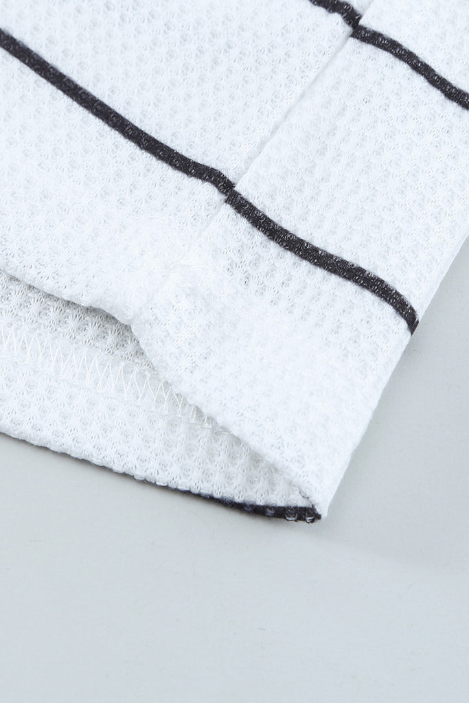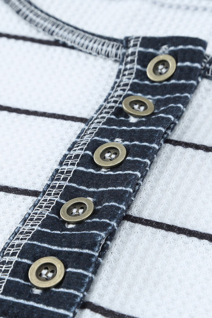Effortlessly casual yet polished, our Weekend Stripe Henley Top brings timeless style to your everyday wardrobe. Crafted in a soft waffle knit with a breathable texture, this long-sleeve top features classic black stripes against a crisp white base, enhanced with a contrast henley button placket and cuffs for a modern twist. The relaxed fit drapes comfortably for all-day wear, while the drop shoulders add a laid-back vibe. Perfect for layering or wearing solo, this piece pairs seamlessly with jeans, shorts, or even layered under a shacket for an effortlessly chic look.
